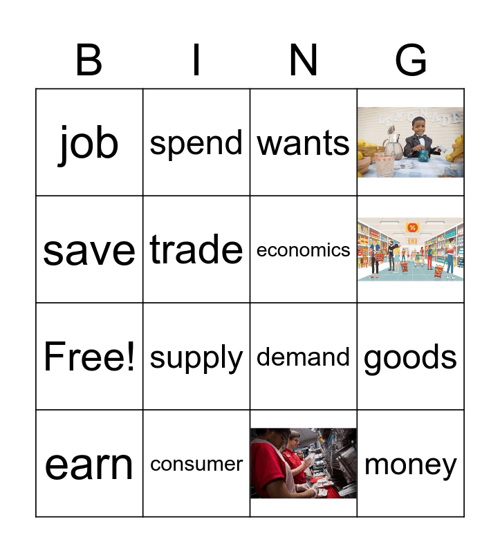 This bingo card has 4 images and 16 words: goods, service, wants, needs, earn, save, consumer, job, Free!, spend, supply, demand, trade, money, economics and producers.
