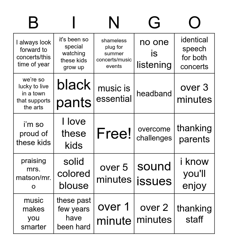 This bingo card has a free space and 29 words: music makes you smarter, hello I’m michelle hiscovitch and I’m the director of the music department here in newtown, I love these kids, they’ve worked so hard, I always look forward to concerts/this time of year, shameless plug for summer concerts/music events, black pants, solid colored blouse, overcome challenges, these past few years have been hard, thanking parents, thanking staff, over 1 minute, over 2 minutes, over 3 minutes, over 4 minutes, over 5 minutes, praising mrs. matson/mr. o, identical speech for both concerts, i’m so proud of these kids, sound issues, pacing on the stage, headband, we’re so lucky to live in a town that supports the arts, no one is listening, it's been so special watching these kids grow up, i know you'll enjoy, music is essential and someone in the audience in on their phone.