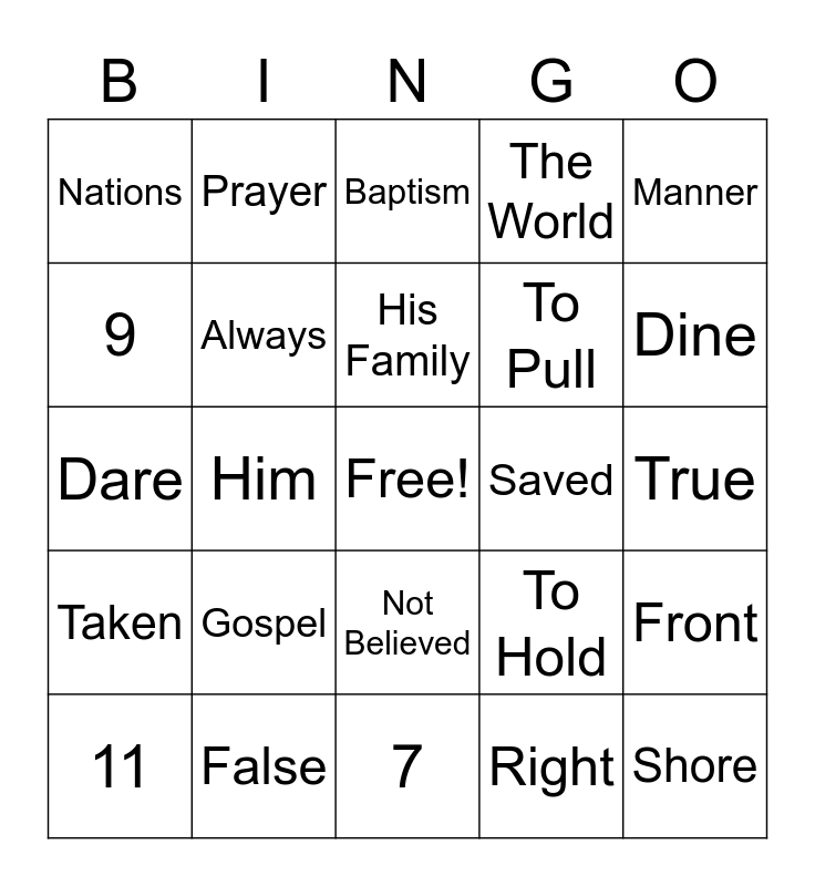 This bingo card has a free space and 29 words: 11, Doubted, Him, Earth, Nations, Baptism, Always, Gospel, Saved, False, True, Shore, 7, Right, Dine, Boats, Not Believed, Taken, Manner, Dare, To Hold, Ordered, To Pull, 9, The World, Prayer, Front, His Family and On A Boat.
