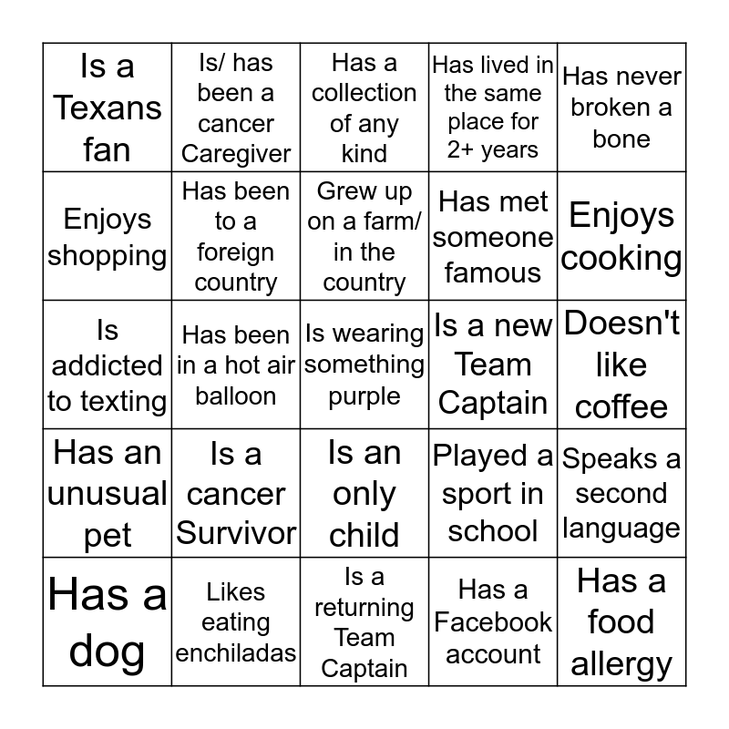 This bingo card has 25 words: Is a cancer Survivor, Is a returning Team Captain, Grew up on a farm/ in the country, Has a dog, Has never broken a bone, Is a Texans fan, Enjoys shopping, Is/ has been a cancer Caregiver, Is a new Team Captain, Is an only child, Has met someone famous, Is addicted to texting, Played a sport in school, Speaks a second language, Has been to a foreign country, Has a food allergy, Doesn't like coffee, Has a collection of any kind, Enjoys cooking, Has been in a hot air balloon, Is wearing something purple, Likes eating enchiladas, Has an unusual pet, Has lived in the same place for 2+ years and Has a Facebook account.