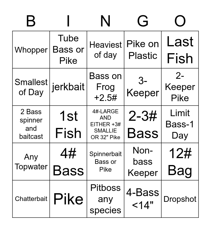 This bingo card has a free space and 24 words: 4# Bass, Pike, Bass on Frog +2.5#, Chatterbait, Last Fish, Whopper, Smallest of Day, Tube Bass or Pike, 2-3# Bass, Spinnerbait Bass or Pike, 3-Keeper, 2 Bass spinner and baitcast, Non-bass Keeper, 12# Bag, jerkbait, 4-Bass <14", Limit Bass-1 Day, Heaviest of day, 2- Keeper Pike, 1st Fish, Dropshot, Any Topwater, Pike on Plastic and Pitboss any species.