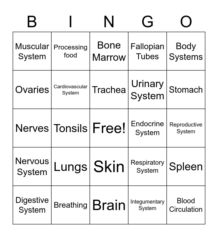 This bingo card has a free space and 29 words: Digestive System, Skeletal, Tonsils, Waste Elimination, Muscular System, Bone Marrow, Cardiovascular System, Lungs, Endocrine System, Breathing, Reproductive System, Blood Circulation, Brain, Integumentary System, Stomach, Lymphatic System, Skin, Nervous System, Body Systems, Nerves, Respiratory System, Stability, Urinary System, Ovaries, Fallopian Tubes, Processing food, Spleen, Trachea and Hair.