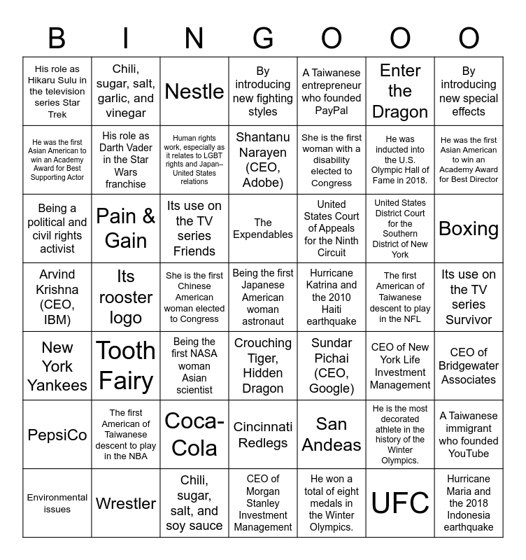 This bingo card has 49 words: He is the most decorated athlete in the history of the Winter Olympics., He was inducted into the U.S. Olympic Hall of Fame in 2018., He won a total of eight medals in the Winter Olympics., Its rooster logo, Its use on the TV series Friends, Its use on the TV series Survivor, Chili, sugar, salt, garlic, and vinegar, Chili, sugar, salt, and soy sauce, Enter the Dragon, Crouching Tiger, Hidden Dragon, By introducing new special effects, By introducing new fighting styles, United States District Court for the Southern District of New York, United States Court of Appeals for the Ninth Circuit, The first American of Taiwanese descent to play in the NBA, The first American of Taiwanese descent to play in the NFL, He was the first Asian American to win an Academy Award for Best Supporting Actor, He was the first Asian American to win an Academy Award for Best Director, A Taiwanese immigrant who founded YouTube, A Taiwanese entrepreneur who founded PayPal, She is the first woman with a disability elected to Congress, She is the first Chinese American woman elected to Congress, His role as Hikaru Sulu in the television series Star Trek, His role as Darth Vader in the Star Wars franchise, Environmental issues, Human rights work, especially as it relates to LGBT rights and Japan–United States relations, Boxing, Wrestler, The Expendables, Pain & Gain, Hurricane Maria and the 2018 Indonesia earthquake, Hurricane Katrina and the 2010 Haiti earthquake, PepsiCo, Coca-Cola, Arvind Krishna (CEO, IBM), Sundar Pichai (CEO, Google), CEO of New York Life Investment Management, CEO of Bridgewater Associates, Being a political and civil rights activist, Being the first NASA woman Asian scientist, Cincinnati Redlegs, New York Yankees, Being the first Japanese American woman astronaut, CEO of Morgan Stanley Investment Management, Shantanu Narayen (CEO, Adobe), Nestle, San Andeas, Tooth Fairy and UFC.
