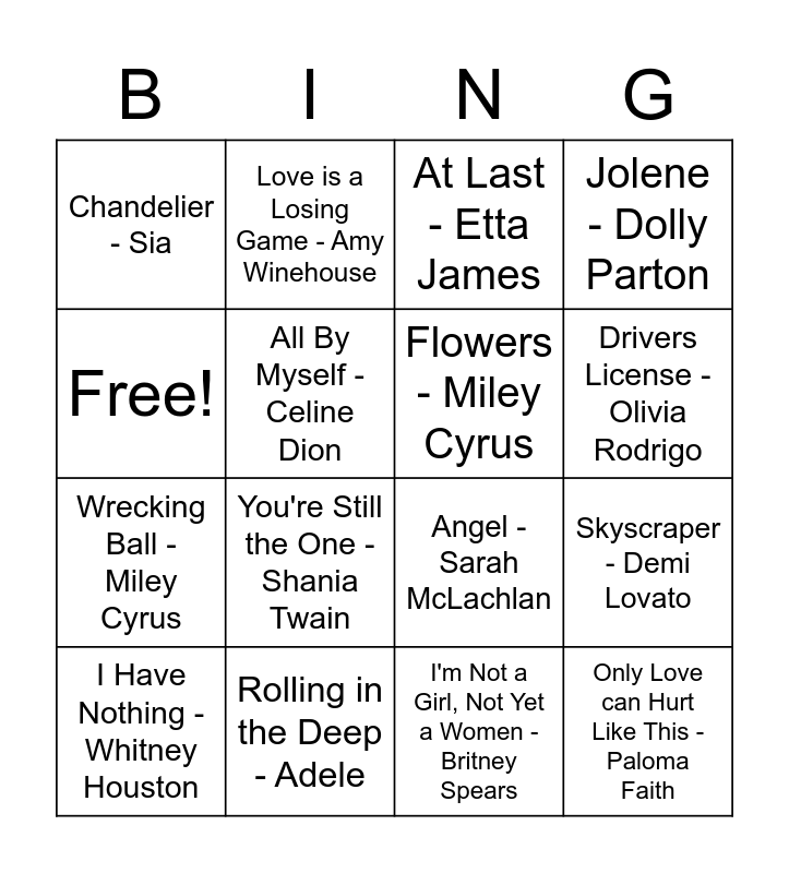 This bingo card has 36 words: It's All Coming Back to Me Now - Celine Dion, Since U Been Gone - Kelly Clarkson, Long Long Time - Linda Rondstadt, Flowers - Miley Cyrus, Lover - Taylor Swift, Only Love can Hurt Like This - Paloma Faith, Drivers License - Olivia Rodrigo, Skinny Love - Birdy, Free!, You're so Vain - Carly Simon, Skyscraper - Demi Lovato, Jolene - Dolly Parton, Try - Pink, Rolling in the Deep - Adele, You're Still the One - Shania Twain, Chandelier - Sia, Breath - Faith Hill, No One - Alicia Keys, I Have Nothing - Whitney Houston, At Last - Etta James, I'm Not a Girl, Not Yet a Women - Britney Spears, I'm Every Woman - Chaka Khan, All for You - Janet Jackson, The Rose - Bette Midler, I Try - Macy Gray, Love is a Losing Game - Amy Winehouse, Angel - Sarah McLachlan, Black Velvet - Alannah Myles, Wrecking Ball - Miley Cyrus, All By Myself - Celine Dion, No Time to Die - Billie Eilish, Rise Up - Andra Day, Lift Me Up - Rihanna, Love on the Brain - Rihanna, You Say - Lauren Daigle and Million Reasons - Lady Gaga.