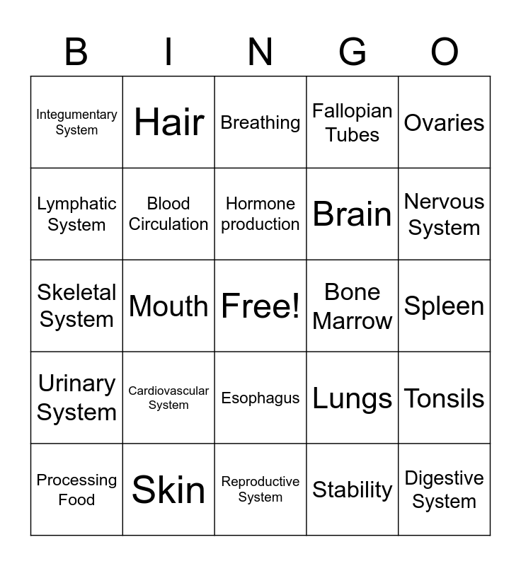 This bingo card has a free space and 29 words: Processing Food, Respiratory System, Mouth, Waste elimination, Integumentary System, Breathing, Blood Circulation, Cardiovascular System, Bone Marrow, Skin, Spleen, Digestive System, Reproductive System, Stability, Nervous System, Muscular System, Esophagus, Urinary System, Ovaries, Skeletal System, Lungs, Endocrine System, Brain, Lymphatic System, Fallopian Tubes, Hair, Tonsils, Hormone production and Trachea.