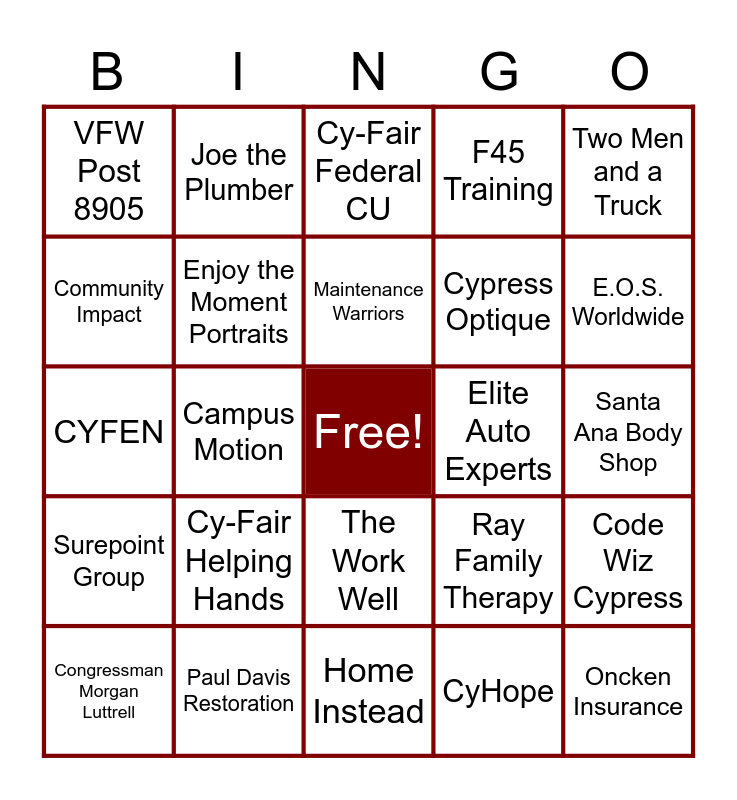 This bingo card has a free space and 45 words: C.A.M., Oncken Insurance, Human Interest, Congressman Morgan Luttrell, Family Ties, CyHope, Cy-Fair Federal CU, Huntington Learning Center, Two Men and a Truck, Paul Davis Restoration, F45 Training, Elite Auto Experts, The Work Well, Cy-Fair Helping Hands, MESA Outreach, Home Instead, ARCpoint Labs, CYFEN, H.C. Dept of Ed., E.O.S. Worldwide, Joe the Plumber, BeeHive Homes, SVSM Capital, VFW Post 8905, Cy-Fair Women's Club, Santa Ana Body Shop, Mathnasium, Homewatch CareGivers, Ray Family Therapy, Surepoint Group, Memorial Hermann, Code Wiz Cypress, Members Choice CU, Aesthetica MD, Simone Lietch Photography, Campus Motion, Office Evolution, Cy-Fair Fire Dept., Boutwell Properties, Maintenance Warriors, Community Impact, Cypress Optique, National Dental Care, Enjoy the Moment Portraits and Village on the Park.