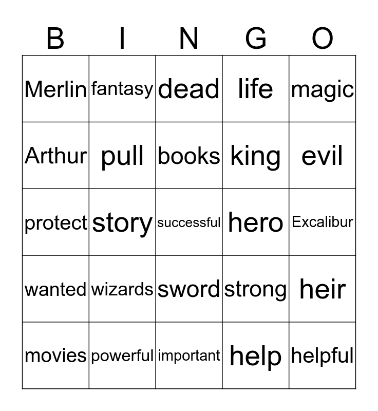 This bingo card has a free space and 24 words: wizards, powerful, books, movies, magic, Merlin, Arthur, fantasy, hero, sword, king, protect, strong, heir, pull, help, Excalibur, dead, evil, story, helpful, wanted, life and important.