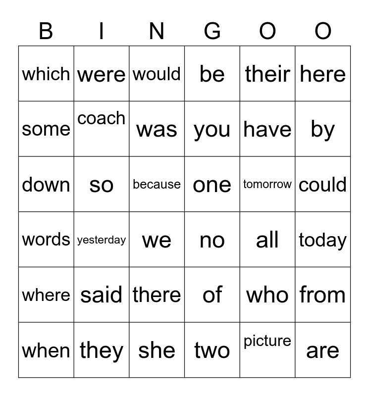 This bingo card has 42 words: picture, coach, how, tomorrow, today, yesterday, down, should, would, could, because, you, by, their, they, words, from, have, are, were, here, there, where, which, what, when, was, says, said, who, once, one, some, all, she, we, no, so, of, two, be and all.