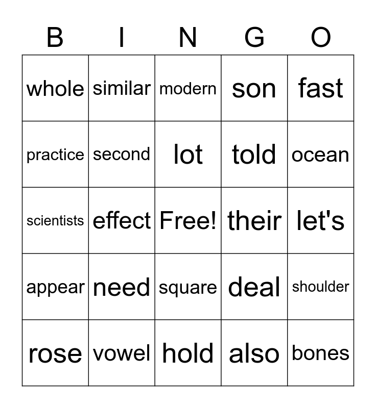 This bingo card has a free space and 24 words: need, vowel, lot, rose, fast, whole, practice, similar, their, square, told, scientists, deal, shoulder, second, also, let's, modern, ocean, effect, bones, appear, son and hold.