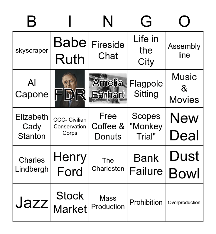 This bingo card has 2 images, a free space and 24 words: Henry Ford, Stock Market, Amelia Earhart, Jazz, Assembly line, skyscraper, Al Capone, Babe Ruth, Scopes "Monkey Trial", The Charleston, Flagpole Sitting, Elizabeth Cady Stanton, Bank Failure, Dust Bowl, FDR, Prohibition, New Deal, Fireside Chat, Music & Movies, CCC- Civilian Conservation Corps, Overproduction, Charles Lindbergh, Life in the City and Mass Production.