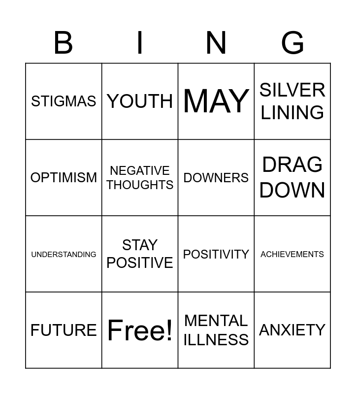 This bingo card has 16 words: Free!, ACHIEVEMENTS, MAY, STIGMAS, UNDERSTANDING, YOUTH, POSITIVITY, MENTAL ILLNESS, OPTIMISM, NEGATIVE THOUGHTS, FUTURE, SILVER LINING, STAY POSITIVE, DRAG DOWN, DOWNERS and ANXIETY.