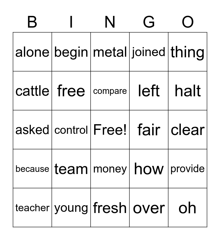 This bingo card has a free space and 24 words: team, young, compare, teacher, thing, alone, cattle, begin, fair, money, left, asked, how, provide, free, over, clear, metal, halt, control, oh, because, joined and fresh.