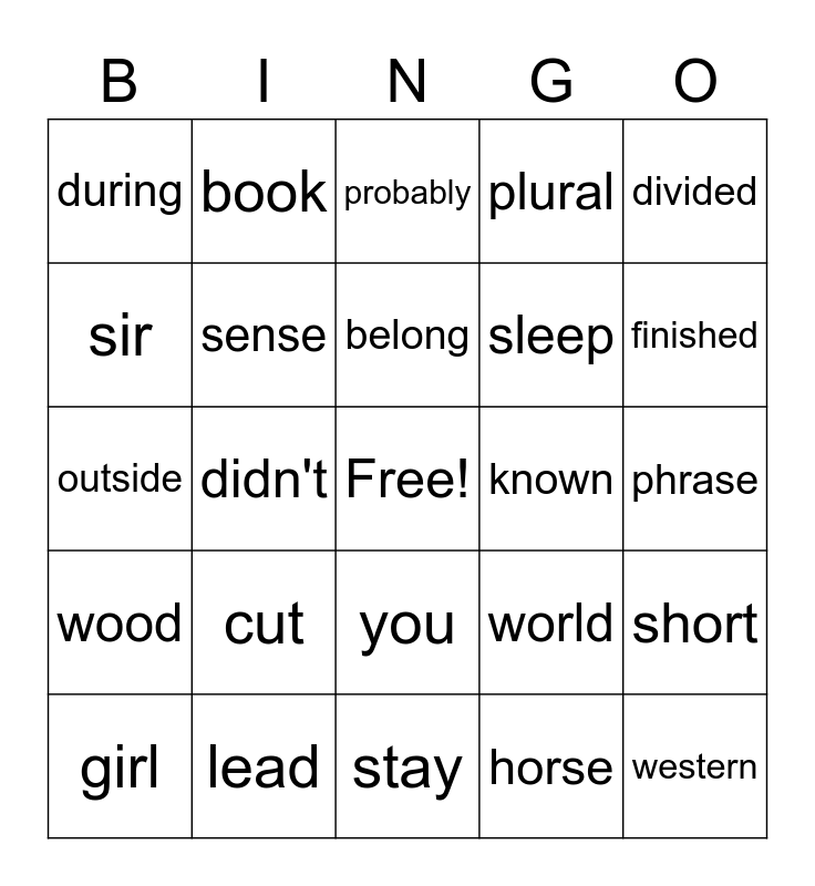 This bingo card has a free space and 24 words: cut, lead, belong, girl, divided, during, sir, book, known, you, sleep, outside, world, short, sense, horse, phrase, probably, finished, didn't, western, wood, plural and stay.