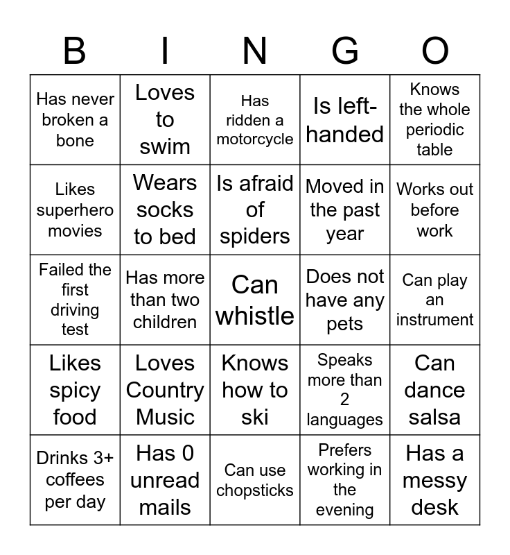 This bingo card has 25 words: Loves Country Music, Can use chopsticks, Is afraid of spiders, Drinks 3+ coffees per day, Knows the whole periodic table, Has never broken a bone, Likes superhero movies, Loves to swim, Does not have any pets, Knows how to ski, Moved in the past year, Failed the first driving test, Speaks more than 2 languages, Can dance salsa, Wears socks to bed, Has a messy desk, Can play an instrument, Has ridden a motorcycle, Works out before work, Has more than two children, Can whistle, Has 0 unread mails, Likes spicy food, Is left-handed and Prefers working in the evening.