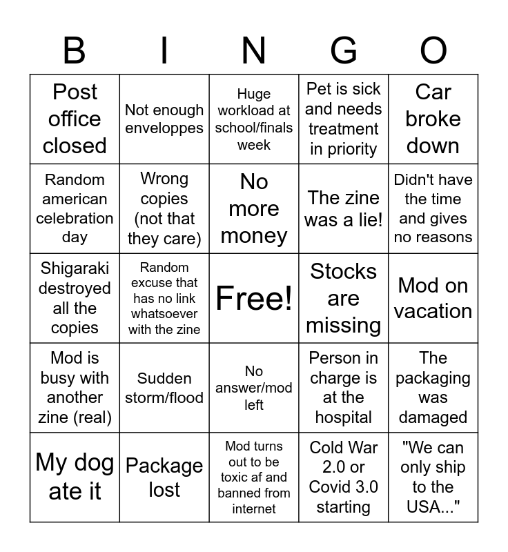 This bingo card has a free space and 24 words: Sudden storm/flood, Package lost, No more money, My dog ate it, Car broke down, Post office closed, Random american celebration day, Not enough enveloppes, Stocks are missing, No answer/mod left, The zine was a lie!, Shigaraki destroyed all the copies, Person in charge is at the hospital, The packaging was damaged, Wrong copies (not that they care), Cold War 2.0 or Covid 3.0 starting, Mod on vacation, Huge workload at school/finals week, Didn't have the time and gives no reasons, Random excuse that has no link whatsoever with the zine, "We can only ship to the USA...", Mod is busy with another zine (real), Pet is sick and needs treatment in priority and Mod turns out to be toxic af and banned from internet.