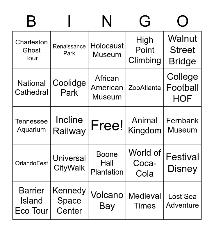 This bingo card has a free space and 75 words: Arlington Cemetery, Ford's Theatre, Holocaust Museum, Iwo Jima Memorial, Mount Vernon, National Archives, Udvar-Hazy, Spy Museum, Capitol Visitors Center, Museum of U.S. Army, Air & Space Museum, White House, African American Museum, National Cathedral, Uptown Alley, Incline Railway, Point Park, Lost Sea Adventure, Ruby Falls, Walnut Street Bridge, Moonpie Store, Tennessee Aquarium, Coolidge Park, Renaissance Park, High Point Climbing, Chickamauga Battlefield, Denzel Carousel, Chattanooga Choo Choo, Chattanooga Zoo, Adventure Sports Innovation, Georgia Aquarium, Atlanta Braves, Stone Mountain, World of Coca-Cola, College Football HOF, ZooAtlanta, SkyWheel Atlanta, Six Flags Georgia, Fernbank Museum, Medieval Times, Delta Flight Museum, Mary Mac's Tea Room, The Varsity, Center for Civil Rights, The King Center, Patriot's Point, Barrier Island Eco Tour, Charleston Ghost Tour, Charleston Market, Angel Oak Tree, Isle of Palms, Boone Hall Plantation, Magnolia Plantation, Arthur Ravenel Bridge, Memorial Waterfront Park, Charleston Harbor Cruise, The Hunley, Marion Square, Fort Sumter, S.C. Aquarium, Universal CityWalk, Islands of Adventure, Universal Studios, Disney Springs, Epcot, Animal Kingdom, Magic Kingdom, Hollywood Studios, SeaWorld Orlando, Festival Disney, OrlandoFest, Kennedy Space Center, Busch Gardens Tampa, Volcano Bay and Cabana Bay.