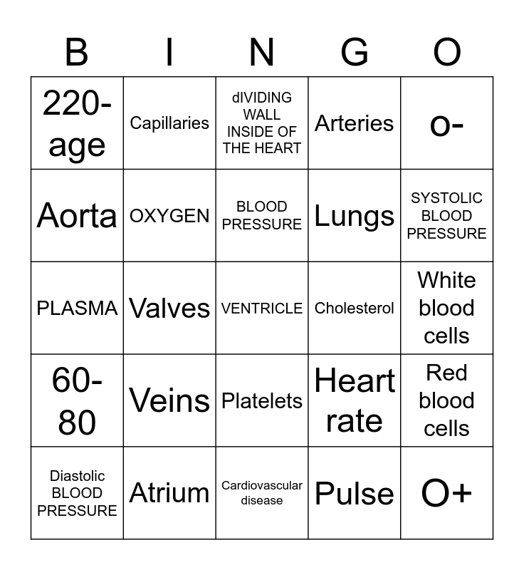 This bingo card has 25 words: Veins, Cardiovascular disease, BLOOD PRESSURE, Diastolic BLOOD PRESSURE, o-, 220-age, Aorta, Capillaries, Cholesterol, Platelets, Lungs, PLASMA, Heart rate, Red blood cells, OXYGEN, O+, White blood cells, dIVIDING WALL INSIDE OF THE HEART, SYSTOLIC BLOOD PRESSURE, Valves, VENTRICLE, Atrium, 60-80, Arteries and Pulse.