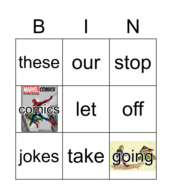 This bingo card has 4 images and 12 words: clean, going, let, off, our, stop, take, think, these, comics, jokes and predict.