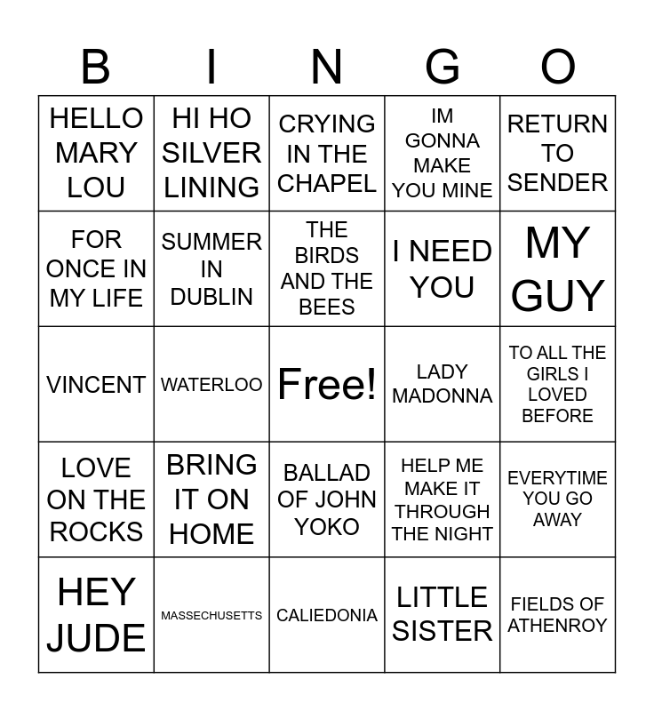 This bingo card has a free space and 43 words: A NATION ONCE AGAIN, FIELDS OF ATHENROY, LETSHANG ON, HEY JUDE, HIS LATEST FLAME, LITTLE SISTER, CRYING IN THE CHAPEL, GOOD LUCK CHARM, RETURN TO SENDER, MASSECHUSETTS, IM GONNA MAKE YOU MINE, LADY MADONNA, BALLAD OF JOHN YOKO, BRING IT ON HOME, CELEBRATION, CALIEDONIA, IF PARADISE WAS HALF AS NICE, VINCENT, YOUNG HEARTS RUN FREE, MY GUY, HI HO SILVER LINING, I BELIEVE I CAN FLY, THE POWER OF LOVE, HELLO MARY LOU, DIANA, TO ALL THE GIRLS I LOVED BEFORE, LONDONS DERRY, I FALL TO PIECES, HELP ME MAKE IT THROUGH THE NIGHT, LOVE ON THE ROCKS, JOE MC DONNELL, EVERYTIME YOU GO AWAY, SHAPE OF YOU, WATERLOO, WHEN THE GOING GETS TOUGH, YOUR NO GOOD, BUILD ME UP BUTTER CUP, THE BIRDS AND THE BEES, FOR ONCE IN MY LIFE, I NEED YOU, MACK THE KNIFE, SUMMER IN DUBLIN and KISS ME HONEY.