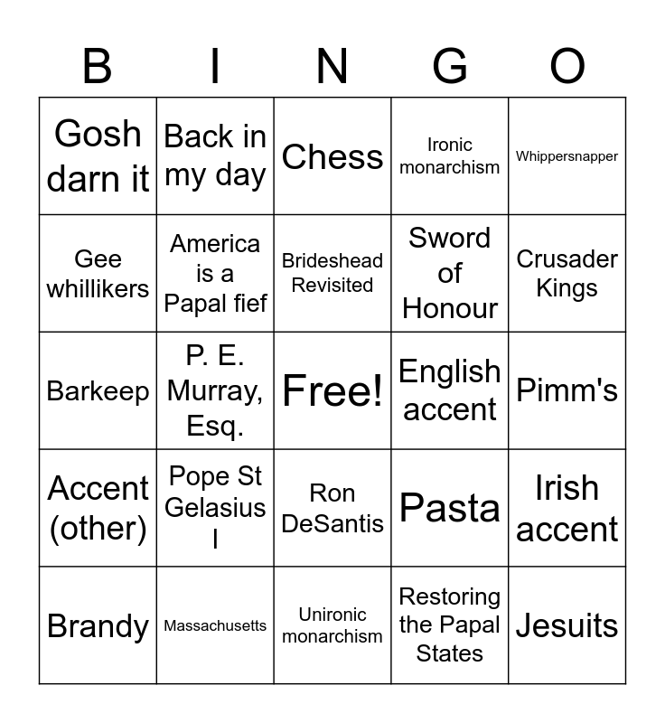 This bingo card has a free space and 24 words: Pope St Gelasius I, Massachusetts, Brideshead Revisited, Brandy, Whippersnapper, Gosh darn it, Gee whillikers, Back in my day, English accent, Ron DeSantis, Sword of Honour, Barkeep, Pasta, Irish accent, America is a Papal fief, Restoring the Papal States, Pimm's, Chess, Crusader Kings, P. E. Murray, Esq., Jesuits, Accent (other), Ironic monarchism and Unironic monarchism.