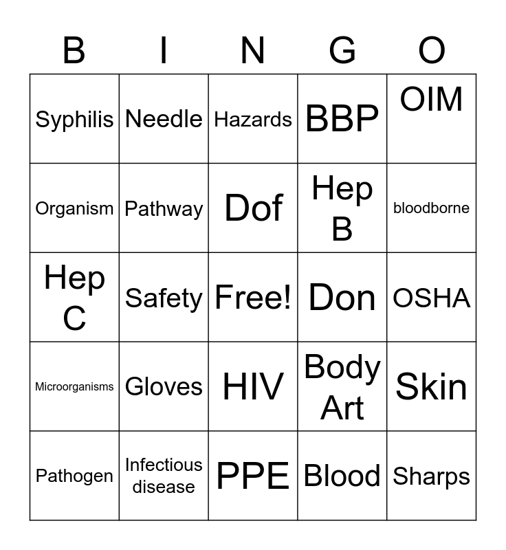 This bingo card has a free space and 25 words: Gloves, PPE, Dof, Pathogen, OIM, Syphilis, Organism, Needle, Don, HIV, Hep B, Hep C, Body Art, Skin, Pathway, Exposure control plan, OSHA, Hazards, bloodborne, Safety, Sharps, Infectious disease, Microorganisms, BBP and Blood.