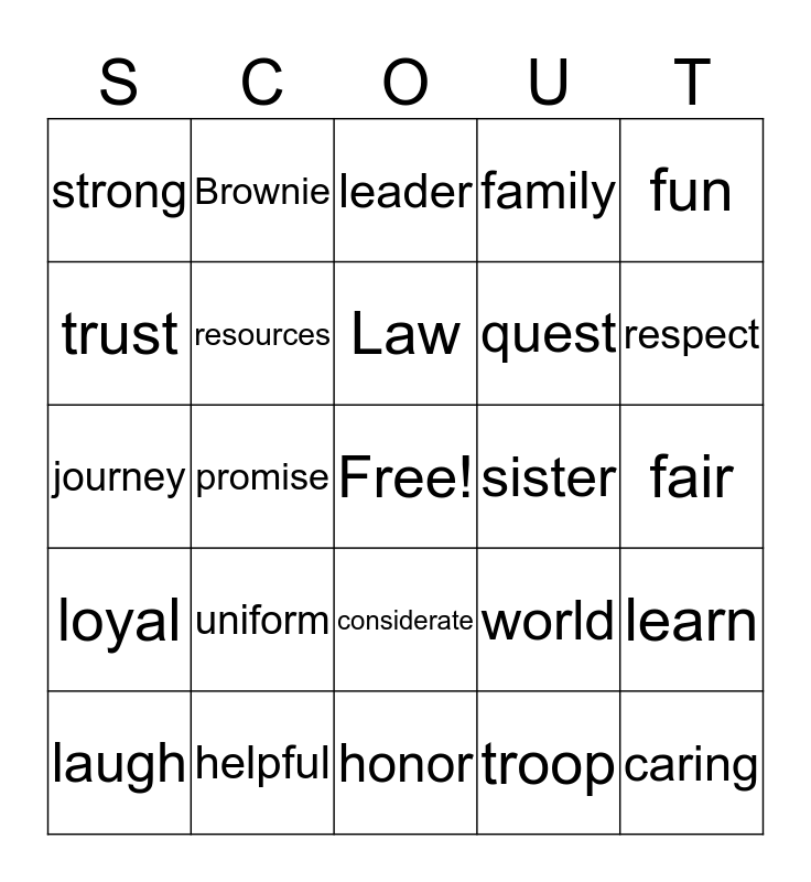 This bingo card has a free space and 24 words: uniform, helpful, Law, laugh, fun, strong, trust, Brownie, sister, considerate, quest, journey, world, learn, resources, troop, fair, leader, respect, promise, caring, loyal, family and honor.