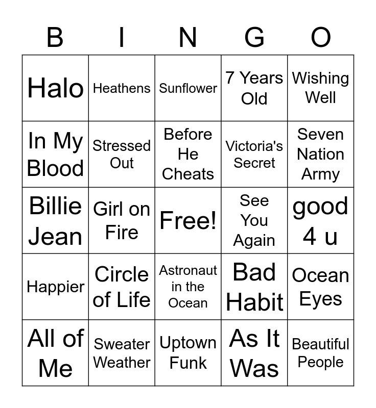 This bingo card has a free space and 24 words: Circle of Life, Sweater Weather, Before He Cheats, All of Me, Wishing Well, Halo, In My Blood, Heathens, See You Again, Astronaut in the Ocean, Victoria's Secret, Billie Jean, Bad Habit, Ocean Eyes, Stressed Out, As It Was, good 4 u, Sunflower, Seven Nation Army, Girl on Fire, Beautiful People, Happier, 7 Years Old and Uptown Funk.