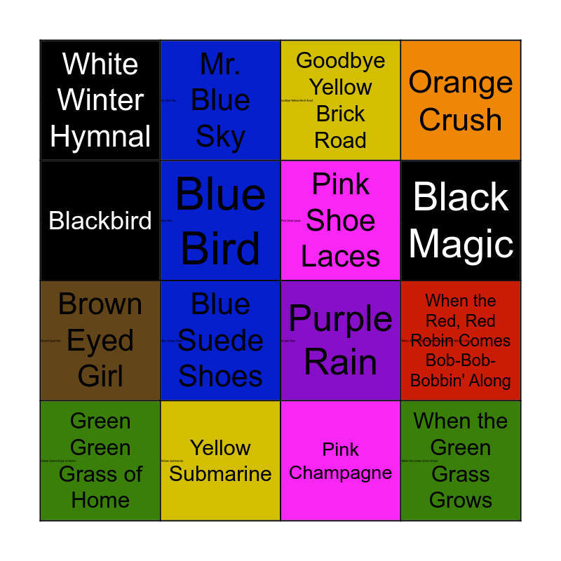 This bingo card has 17 images and 20 words: When the Red, Red Robin Comes Bob-Bob-Bobbin' Along, Orange Colored Sky, Goodbye Yellow Brick Road, Itsy Bitsy Teenie Weenie Yellow Polka Dot Bikini-, Green Green Grass of Home, Blackbird, Yellow Submarine, White Winter Hymnal, Brown Eyed Girl, Mr. Blue Sky, Blue Suede Shoes, Purple Rain, Blue Bird, When the Green Grass Grows, Pink Shoe Laces, 99 Red Balloons, Black Magic, Orange Crush, Pink Champagne and White Rabbit.
