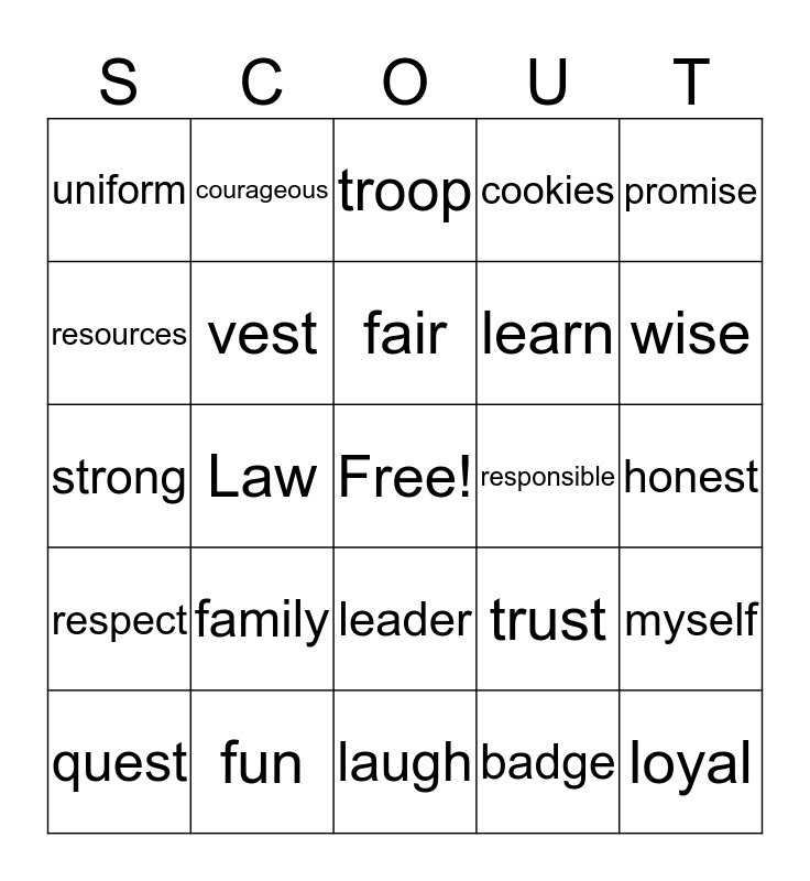 This bingo card has a free space and 24 words: family, fun, fair, quest, promise, uniform, resources, courageous, responsible, leader, learn, strong, trust, myself, vest, badge, honest, troop, wise, Law, loyal, respect, cookies and laugh.
