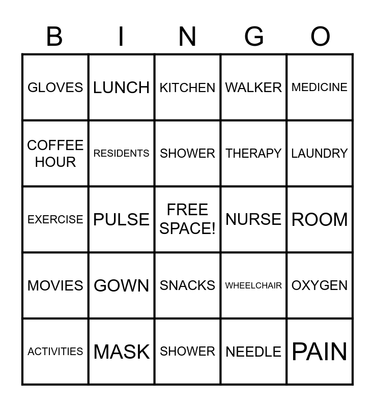 This bingo card has a free space and 24 words: GOWN, MASK, SHOWER, ACTIVITIES, MEDICINE, GLOVES, COFFEE HOUR, LUNCH, NURSE, SNACKS, THERAPY, EXERCISE, WHEELCHAIR, OXYGEN, RESIDENTS, NEEDLE, ROOM, KITCHEN, LAUNDRY, PULSE, PAIN, MOVIES, WALKER and SHOWER.