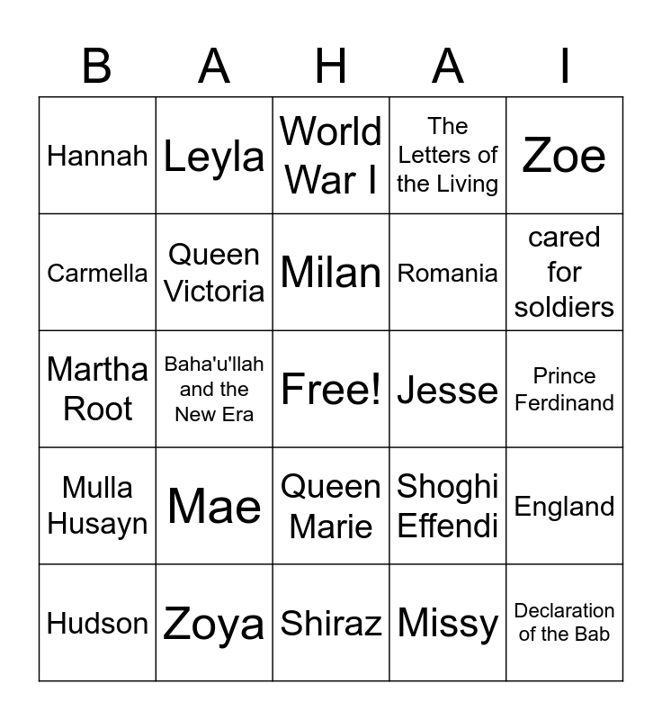 This bingo card has a free space and 24 words: Mae, Zoya, Milan, Hudson, Zoe, Hannah, Carmella, Leyla, Jesse, Queen Marie, Romania, Martha Root, Shoghi Effendi, England, Queen Victoria, Missy, Prince Ferdinand, World War I, cared for soldiers, Baha'u'llah and the New Era, Declaration of the Bab, Mulla Husayn, The Letters of the Living and Shiraz.