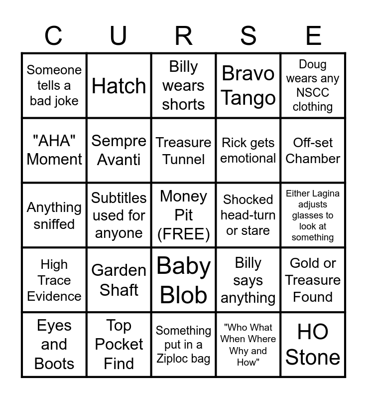 This bingo card has a free space and 24 words: Garden Shaft, Top Pocket Find, Treasure Tunnel, Eyes and Boots, Doug wears any NSCC clothing, Someone tells a bad joke, "AHA" Moment, Hatch, Shocked head-turn or stare, Baby Blob, Rick gets emotional, Anything sniffed, Billy says anything, Gold or Treasure Found, Sempre Avanti, "Who What When Where Why and How", Either Lagina adjusts glasses to look at something, Billy wears shorts, Off-set Chamber, Subtitles used for anyone, HO Stone, High Trace Evidence, Bravo Tango and Something put in a Ziploc bag.