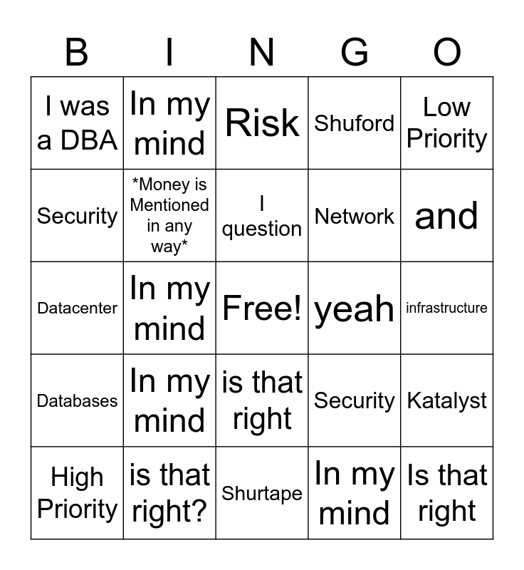 This bingo card has a free space and 24 words: In my mind, is that right?, I question, High Priority, Low Priority, I was a DBA, Security, In my mind, yeah, is that right, Network, Datacenter, Security, Katalyst, *Money is Mentioned in any way*, In my mind, infrastructure, Risk, and, In my mind, Is that right, Databases, Shuford and Shurtape.