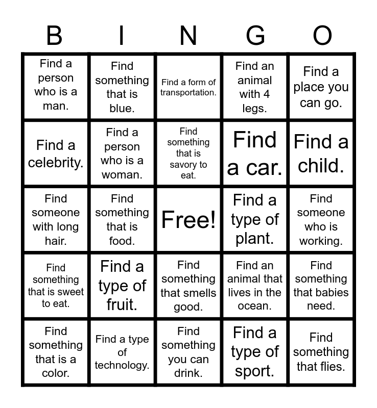 This bingo card has a free space and 29 words: Find something that is a color., Find something that is a piece of clothing., Find something that is food., Find any type of animal., Find a person who is a man., Find a form of transportation., Find a person who is a woman., Find a type of fruit., Find a type of plant., Find a type of technology., Find someone who is working., Find something that flies., Find something you can drink., Find a type of sport., Find a child., Find something that starts with the letter F., Find something that smells good., Find something that is sweet to eat., Find a place you can go., Find someone with long hair., Find an animal that lives in the ocean., Find something that is red., Find a car., Find a celebrity., Find an animal with 4 legs., Find something that is blue., Find something that babies need., Find something that is savory to eat. and Find something that stinks..