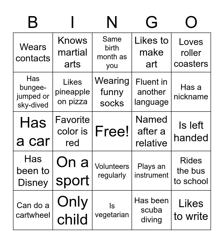 This bingo card has a free space and 34 words: Has a dog, Has been scuba diving, Likes math, Reads 10+ books a year, Has been to Disney, Likes pineapple on pizza, Loves roller coasters, Can do a cartwheel, Knows martial arts, Love karaoke, Wearing funny socks, Same birth month as you, Never flown in an airplane, Has broken a bone, Named after a relative, Has a nickname, Only child, Has a car, On a sport, Plays an instrument, Volunteers regularly, Has a cat, Wears contacts, Is left handed, Is vegetarian, Likes to write, Likes to make art, Moved here from another state, Fluent in another language, Has bungee- jumped or sky-dived, Traveled to another country, Favorite color is red, Rides the bus to school and Buys lunch everyday.