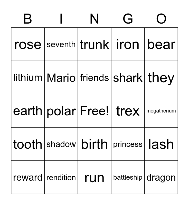 This bingo card has a free space and 57 words: ratio, reward, red, rose, run, sort, Mario, words, shark, uranium, iron, horriblin, four, water, tear, star, bear, polar, brush, dragon, trex, truck, princess, trunk, french, friends, crayon, them, they, three, those, think, toothbrush, Martha, megatherium, lithium, ethereal, earth, mirth, tooth, seventh, birth, she, sheep, shame, short, shadow, rendition, ratio, vacation, nation, battleship, peckish, crash, rash, lash and brash.