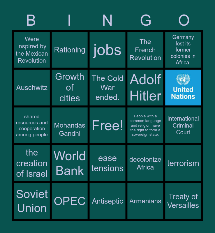 This bingo card has 2 images, a free space and 32 words: by allowing farmers to leave fields fallow less often, Armenians, Lend-Lease Act, the creation of Israel, Growth of cities, Germany lost its former colonies in Africa., Soviet Union, Rationing, a policy of racist laws in South Africa., The Cold War ended., jobs, Iron Curtain, The United States entered the war., People with a common language and religion have the right to form a sovereign state., OPEC, shared resources and cooperation among people, World Bank, decolonize Africa, ease tensions, Democratic Republic of Congo, Were inspired by the Mexican Revolution, International Criminal Court, Antiseptic, Treaty of Versailles, The French Revolution, Mikhail Gorbachev, Adolf Hitler, Auschwitz, Rwandan Genocide, Mohandas Gandhi, terrorism and capitalism.