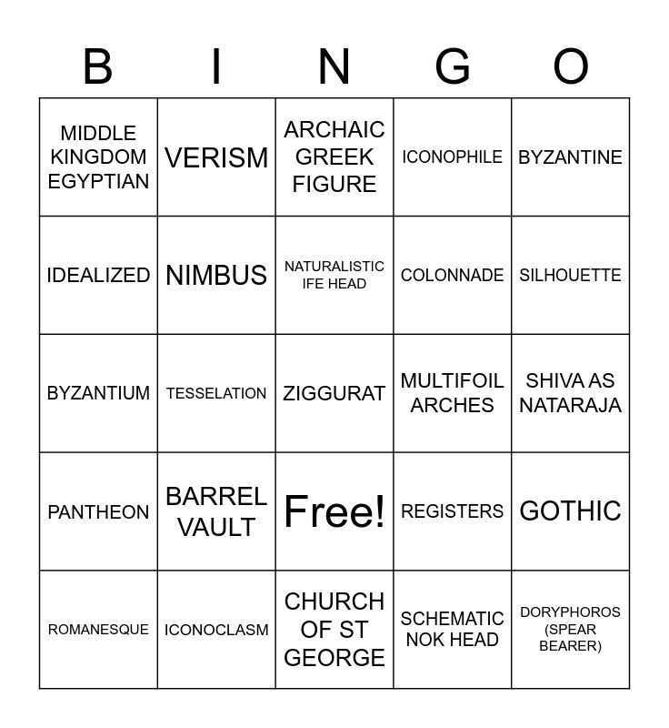 This bingo card has 26 words: Free!, SCHEMATIC NOK HEAD, NATURALISTIC IFE HEAD, ICONOCLASM, BYZANTINE, MIDDLE KINGDOM EGYPTIAN, IDEALIZED, VERISM, SHIVA AS NATARAJA, REGISTERS, COLONNADE, BYZANTIUM, GOTHIC, ROMANESQUE, TESSELATION, PILGRIMAGE, ICONOPHILE, PANTHEON, ARCHAIC GREEK FIGURE, ZIGGURAT, SILHOUETTE, CHURCH OF ST GEORGE, MULTIFOIL ARCHES, BARREL VAULT, NIMBUS and DORYPHOROS (SPEAR BEARER).