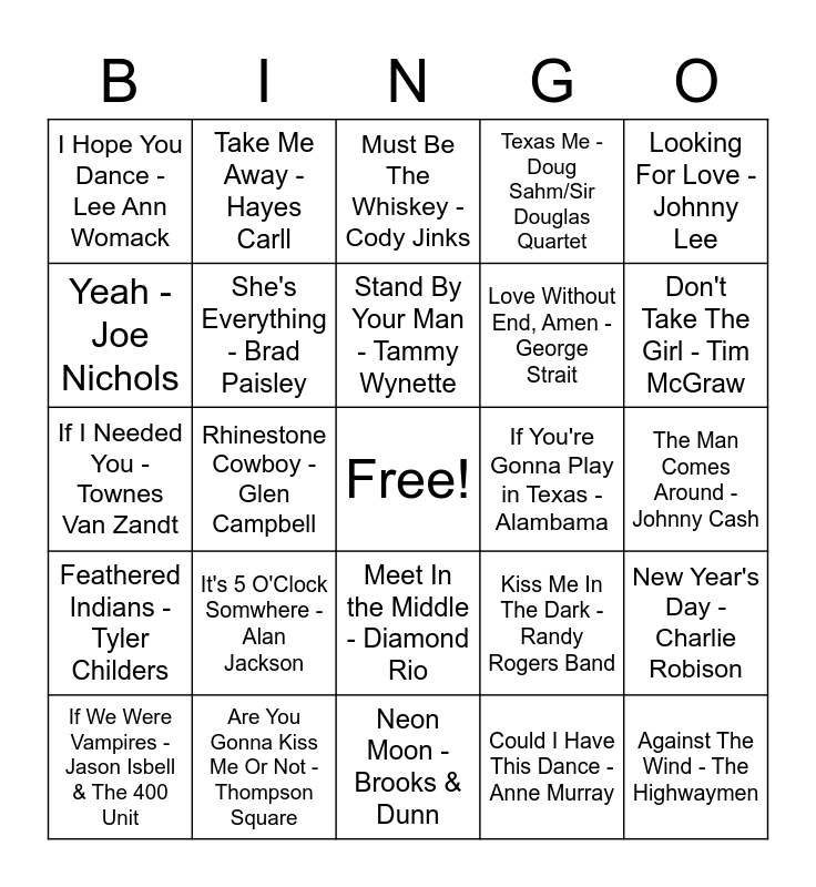 This bingo card has a free space and 50 words: Need You Now - Lady A, Against The Wind - The Highwaymen, How Do I Live - LeAnn Rhimes, Neon Moon - Brooks & Dunn, It's 5 O'Clock Somwhere - Alan Jackson, Breathe - Faith Hill, Take Me Away - Hayes Carll, What Hurts The Most - Rascal Flatts, Yeah - Joe Nichols, Your Man - Josh Turner, She's Everything - Brad Paisley, Texas Me - Doug Sahm/Sir Douglas Quartet, New Year's Day - Charlie Robison, Kiss Me In The Dark - Randy Rogers Band, The Night The Lights Went Out In Georgia - Reba McEntire, The Gambler - Kenny Rogers, Stand By Your Man - Tammy Wynette, If You're Gonna Play in Texas - Alambama, Here Comes The Hurt Again - Mickey Gilley, Looking For Love - Johnny Lee, Rhinestone Cowboy - Glen Campbell, Could I Have This Dance - Anne Murray, I Hope You Dance - Lee Ann Womack, Love Without End, Amen - George Strait, Wasted - Carrie Underwood, Amazed - Lonestar, Don't Take The Girl - Tim McGraw, What Might Have Been - Little Texas, Must Be The Whiskey - Cody Jinks, Meet In the Middle - Diamond Rio, No One Else on Earth - Wynonna, She Don't Know She's Beautiful - Sammy Kershaw, The World is On Fire - American Aquarium, Graceland - Justin Townes Earle, Are You Gonna Kiss Me Or Not - Thompson Square, Wagon Wheel - Darius Rucker, She's In Love With The Boy - Trisha Yearwood, Forever and Ever, Amen - Randy Travis, Tennesse Whiskey - Chris Stapleton, The Man Comes Around - Johnny Cash, I Wouldn't Have Missed It For The World - Ronnie Milsap, Memory - Old Dominion, You, Miss, And Whiskey - Justin Moore & Priscilla Block, Last Night - Morgan Wallen, If We Were Vampires - Jason Isbell & The 400 Unit, If I Needed You - Townes Van Zandt, Dublin Blues - Guy Clark, I Don't Want to Lose You Yet - Steve Earle, Feathered Indians - Tyler Childers and Wilder Days - Morgan Wade.
