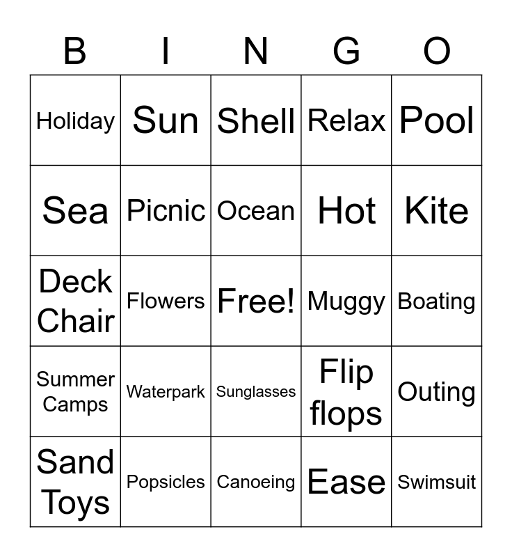 This bingo card has a free space and 50 words: Beach, Swimsuit, Camping, Canoeing, Waterpark, Season, Sun, Swim, Sea, Watermelon, Picnic, Relax, Outing, Flip flops, Vacation, Trip, Ocean, Muggy, Ice cream, Pool, Flowers, Ease, Holiday, Hot, Fan, Lemonade, Kite, Sunscreen, Shell, Sunglasses, Towel, Sandcastle, Beach Ball, Float, Popsicles, Surfboard, Warmth, Tan, Air Conditioner, Boating, Gardening, Humidity, Coconut palm, Visitor, Sand Toys, Deck Chair, Hat, Travel, Summer Camps and Backpack.