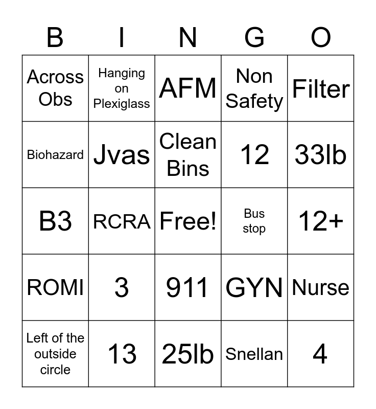 This bingo card has a free space and 24 words: 3, 13, Clean Bins, Left of the outside circle, Filter, Across Obs, Biohazard, Hanging on Plexiglass, Bus stop, 911, 12, B3, GYN, Nurse, Jvas, Snellan, 12+, AFM, 33lb, RCRA, 4, ROMI, Non Safety and 25lb.