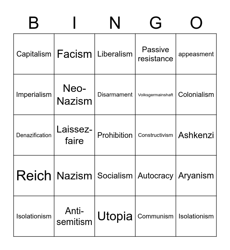 This bingo card has a free space and 24 words: Nazism, Anti-semitism, Disarmament, Isolationism, appeasment, Capitalism, Imperialism, Facism, Constructivism, Socialism, Volksgermainshaft, Denazification, Autocracy, Aryanism, Neo-Nazism, Communism, Ashkenzi, Liberalism, Colonialism, Laissez-faire, Isolationism, Reich, Passive resistance and Utopia.