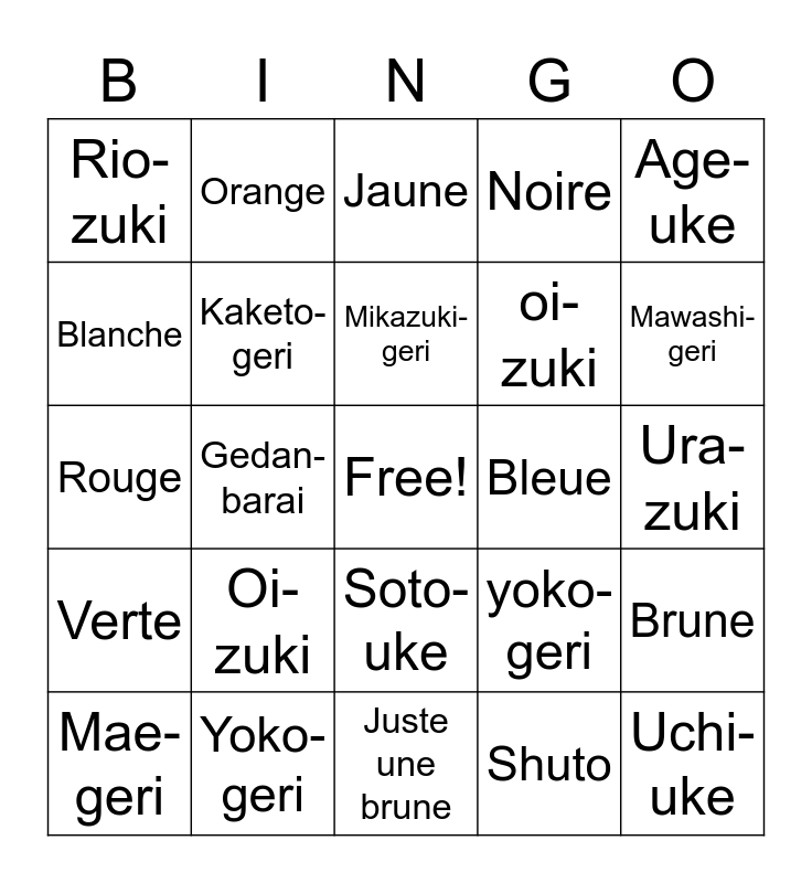 This bingo card has a free space and 27 words: yoko-geri, mawashi-geri, oi-zuki, Juste une brune, Blanche, Jaune, Orange, Verte, Bleue, Brune, Rouge, Noire, Mae-geri, Yoko-geri, Mawashi-geri, Ushiro-geri, Kaketo-geri, Mikazuki-geri, Oi-zuki, Rio-zuki, Ura-zuki, Shuto, Gedan-barai, Uchi-uke, Soto-uke, Age-uke and Nagashi-uke.