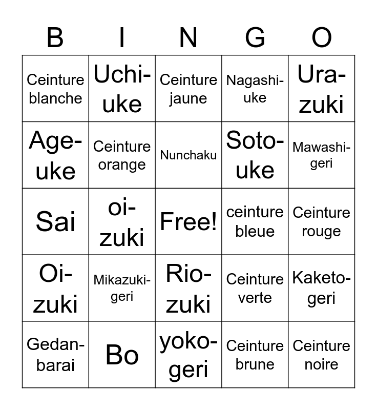 This bingo card has a free space and 31 words: yoko-geri, mawashi-geri, oi-zuki, Juste une brune, Ceinture blanche, Ceinture jaune, Ceinture orange, Ceinture verte, ceinture bleue, Ceinture brune, Ceinture rouge, Ceinture noire, Mae-geri, Yoko-geri, Mawashi-geri, Ushiro-geri, Kaketo-geri, Mikazuki-geri, Oi-zuki, Rio-zuki, Ura-zuki, Shuto, Gedan-barai, Uchi-uke, Soto-uke, Age-uke, Nagashi-uke, Sai, Bo, Nunchaku and Katana.