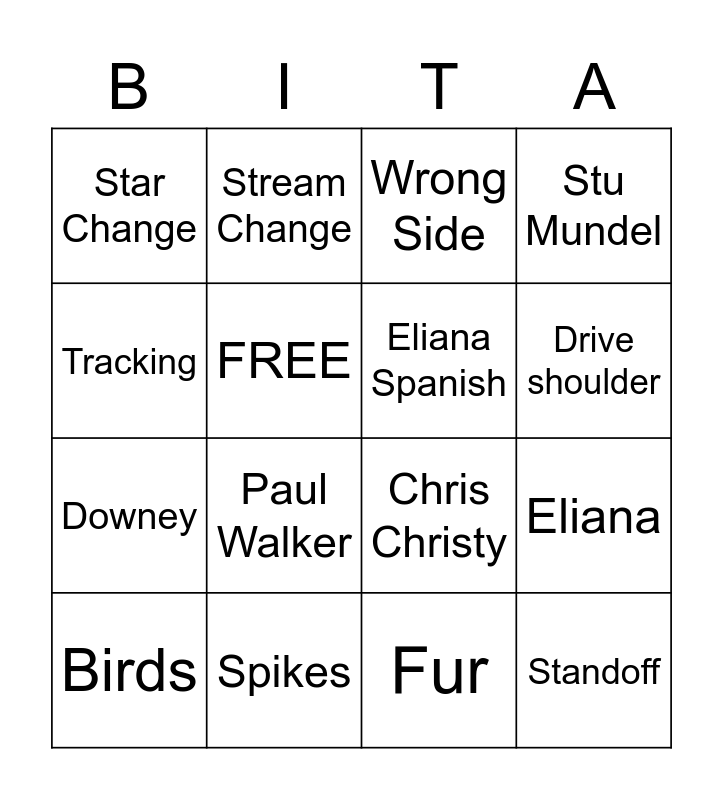 This bingo card has 16 words: Spikes, Eliana, Wrong Side, Star Change, Downey, Stream Change, Chris Christy, Fur, Tracking, FREE, Birds, Stu Mundel, Paul Walker, Drive shoulder, Eliana Spanish and Standoff.