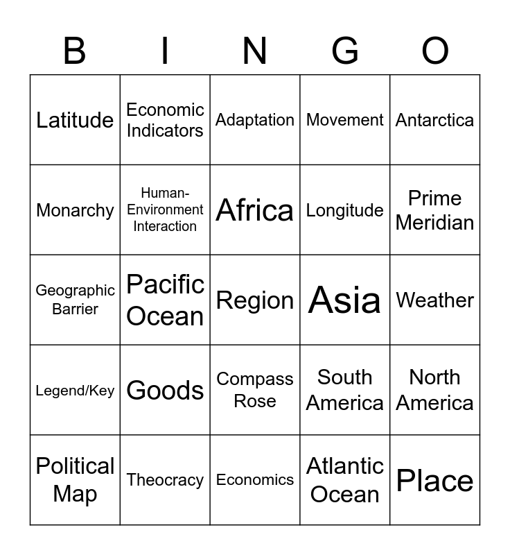 This bingo card has a free space and 49 words: Geography, Place, Location, Economics, Goods, Services, Economic Indicators, Government, Monarchy, Democracy, Human-Environment Interaction, Movement, North America, South America, Europe, Asia, Africa, Asia, Australia, Antarctica, Pacific Ocean, Atlantic Ocean, Latitude, Longitude, Equator, Prime Meridian, Political Map, Physical Map, Compass Rose, Legend/Key, Scale, Population, Urban, Rural, Theocracy, Dictatorship, Anarchy, Globalization, Weather, Climate, Humidity, Atmosphere, Precipitation, Temperature, Geographic Barrier, Adaptation, Modification, Geographic factor and Human factor.