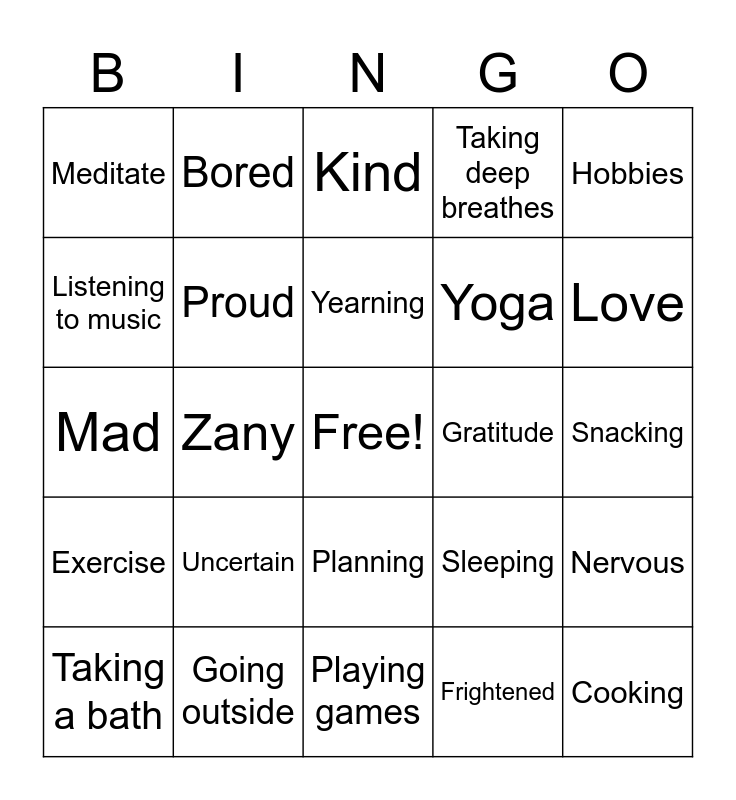 This bingo card has a free space and 54 words: Mindfulness, Exercise, Reading, Drawing, Planning, Talking with friends, Taking deep breathes, Writing in a journal, Listening to music, Unplugging from technology, Meditate, Playing with pets, Going outside, Taking a bath, Cleaning, Playing games, Cooking, Yoga, Gardening, Snacking, Sleeping, Watching TV, Gratitude, Hobbies, Agitated, Bored, Confident, Disappointed, Embarrassed, Frightened, Grateful, Happy, Irritated, Joyous, Kind, Lonely, Mad, Nervous, Overwhelmed, Proud, Quiet, Relaxed, Sad, Tired, Uncertain, Valued, Worried, Excited, Yearning, Zany, Love, Curious, Energetic and Safe.