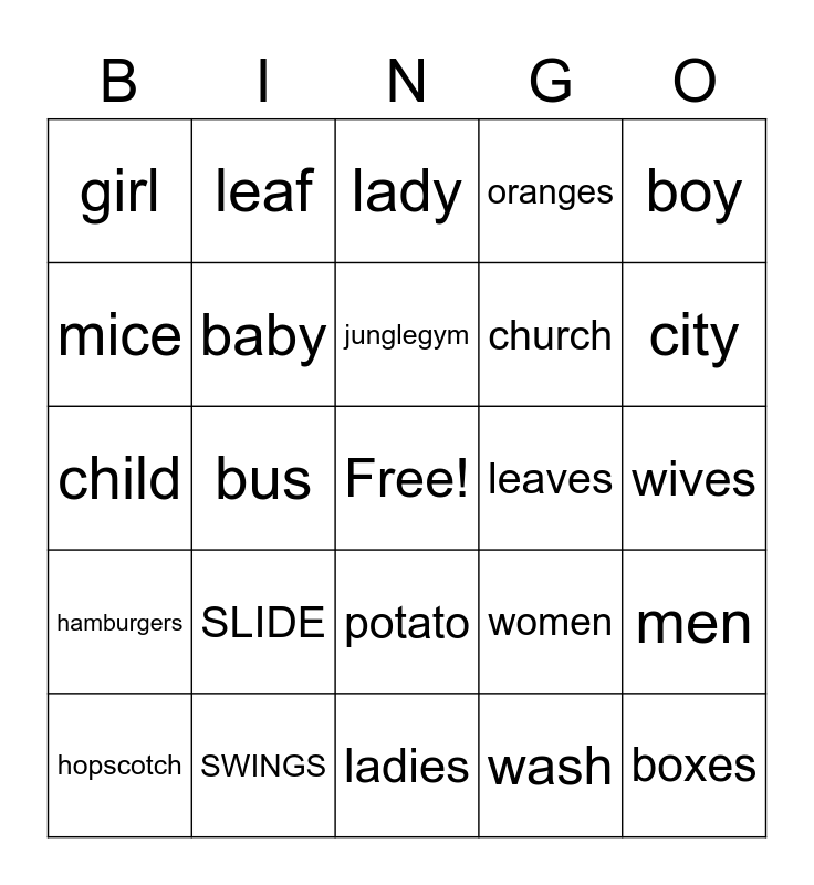 This bingo card has a free space and 24 words: SLIDE, SWINGS, junglegym, hopscotch, boy, girl, mice, leaf, leaves, potato, church, child, women, men, baby, wash, wives, lady, city, bus, boxes, hamburgers, oranges and ladies.