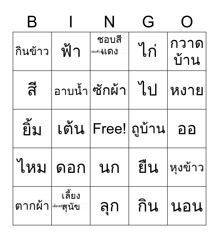 This bingo card has 3 images, a free space and 29 words: ชอบสีฟ้า, เลี้ยงสุนัข, ชอบสีแดง, ล้างจาน, กวาดบ้าน, กินข้าว, อาบน้ำ, ซักผ้า, ถูบ้าน, หุงข้าว, ตากผ้า, เต้น, กิน, นอน, ยิ้ม, นั่ง, ลุก, ยืน, หงาย, ไหม, ดอก, มา, ไป, ออ, สี, ฟ้า, นก, ไก่ and ไป.