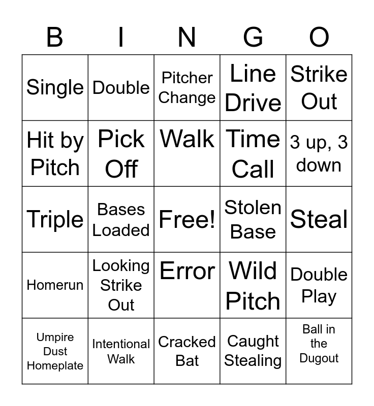 This bingo card has a free space and 24 words: Looking Strike Out, Intentional Walk, Walk, Umpire Dust Homeplate, Strike Out, Single, Hit by Pitch, Double, Stolen Base, Error, Time Call, Triple, Wild Pitch, Double Play, Pick Off, Caught Stealing, Steal, Pitcher Change, 3 up, 3 down, Bases Loaded, Ball in the Dugout, Homerun, Line Drive and Cracked Bat.